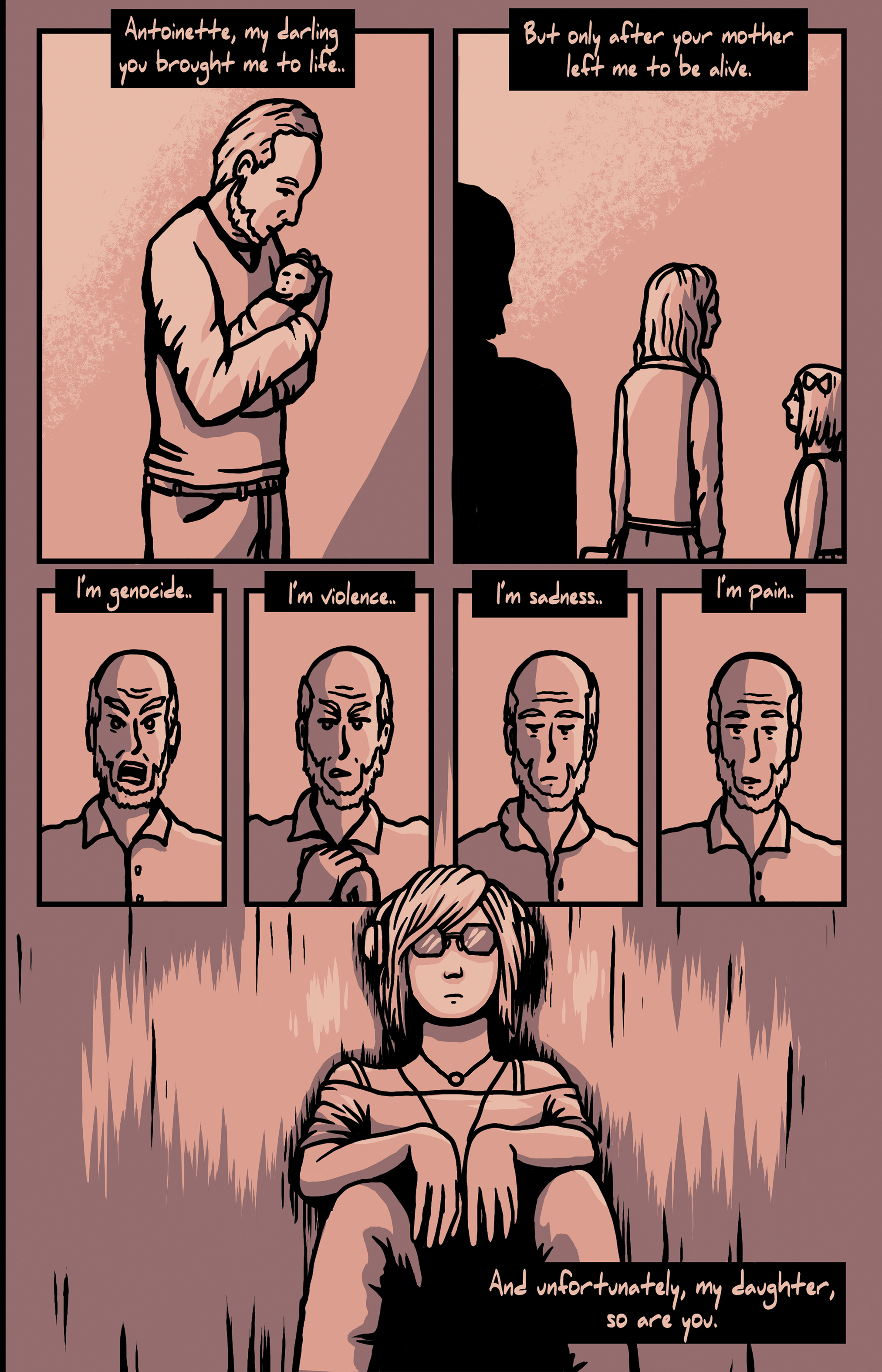 Is it possible to escape the darkness we're born with? Fathers & Gods is a 90 page poetic graphic novel that tells the story of Antoinette as she runs away from home, hell bent on escaping her religious, mentally-unstable father; or is it a story of a pious father looking to save his pyro-obsessed daughter? Each chapter of this story is told through the other's perspective, as they both battle this darkness inside of them. It's a tale as old as time, but can they control it before it destroys themselves?